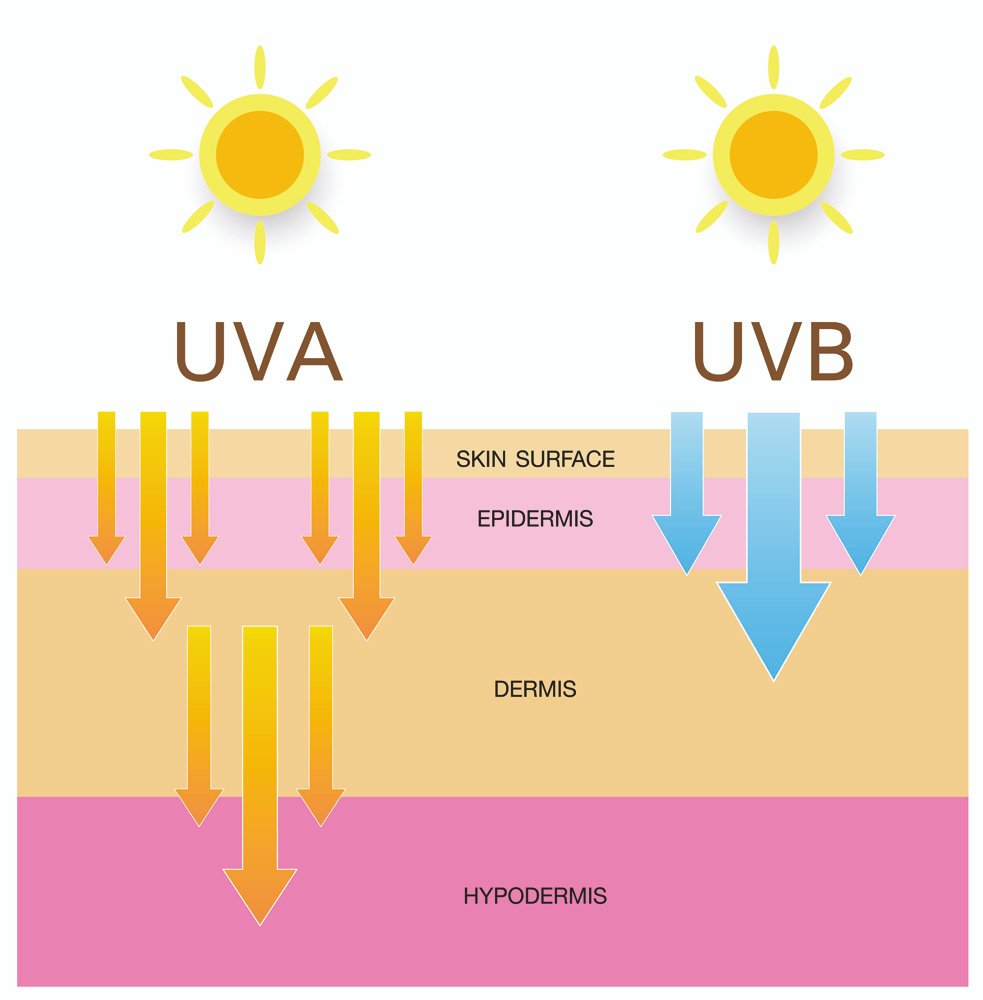 Figure 4. The difference between penetration ability into deeper skin layers of UVA and UVB. As UVA penetrates deeper, it has more potential for SNA damage, so can irradiate pheomeloanin, causing the production of reactive oxygen species. This DNS damage can potentially lead to skin cancer.