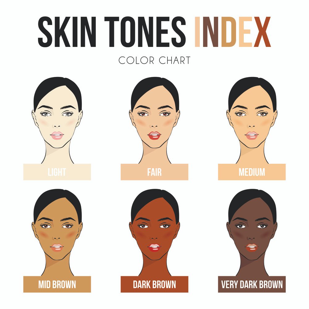 Figure 2. Image of the different types of skin tones seen in the population. Darker skin is generated due to a higher concentration of eumelanin, whereas lighter skin is produced through a greater density of pheomelanin.