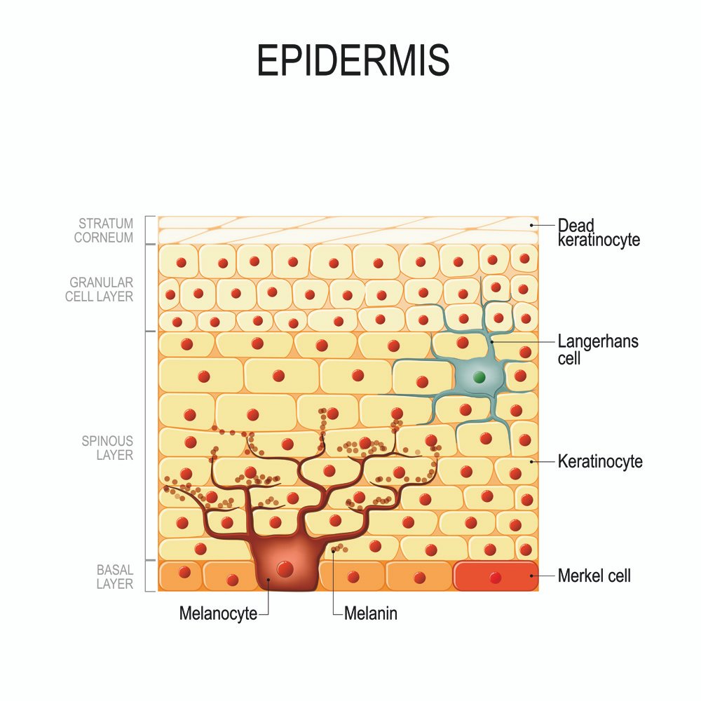 Figure 1. Epidermal layers of the skin in humans showing the position and structures of the melanocytes in the basal layer.